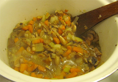 Положите в кастрюлю грибы, перемешайте с луком и морковью, добавьте немного воды или грибного отвара и накройте крышкой.